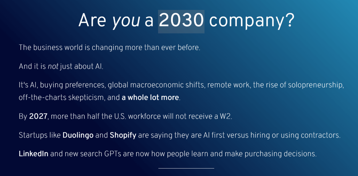 If you're still operating like it's 2018, where you’re relying on referrals, long retainers, or packaging knowledge into deliverables you won't make it to 2030.