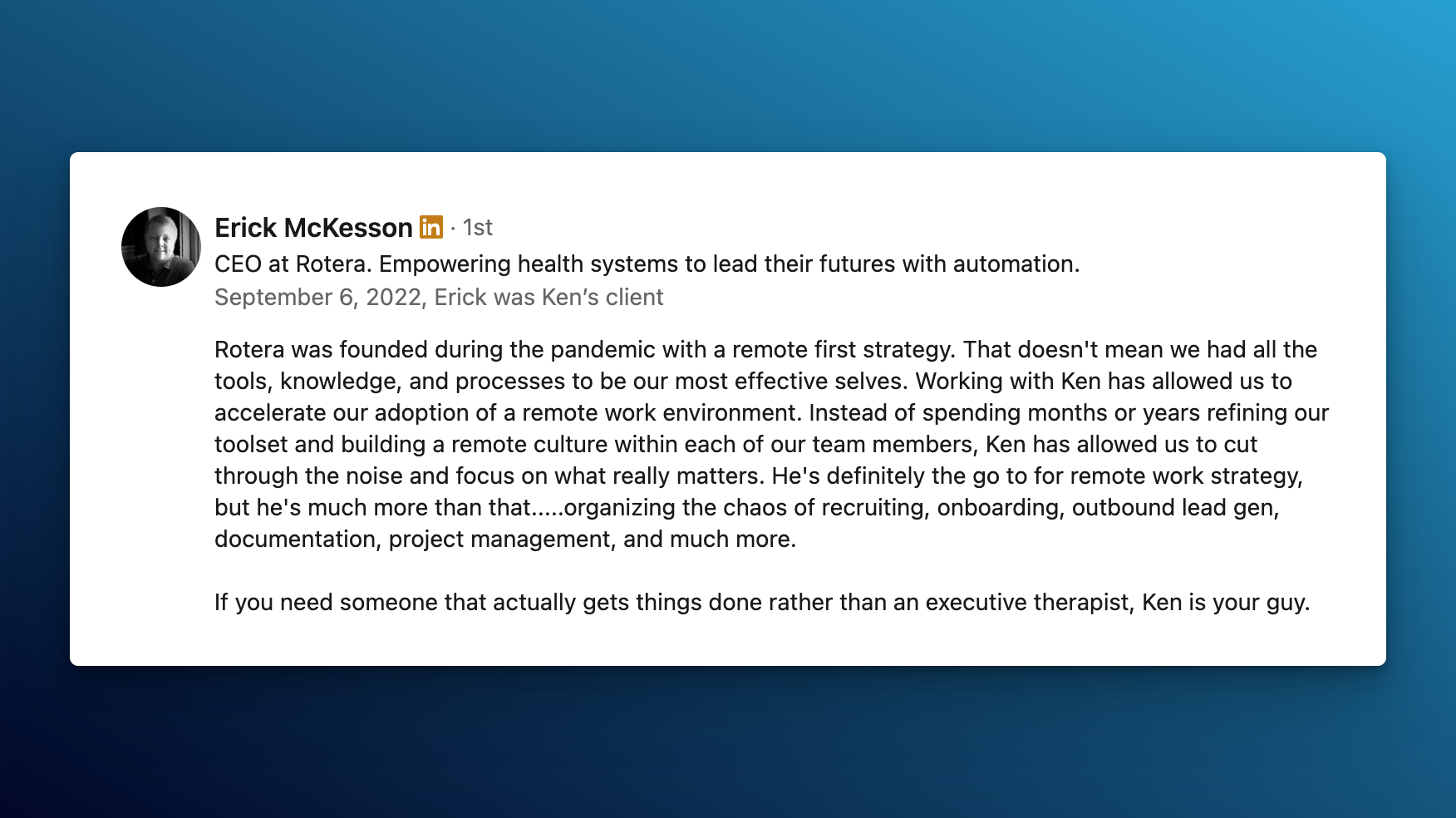 - My fractional work helped a tech CEO who had grown previous companies but wanted to scale the right way in his current venture. He went from busy weeks where he felt like he was drowning to a robust set of processes and a company operating system prepared for future growth.