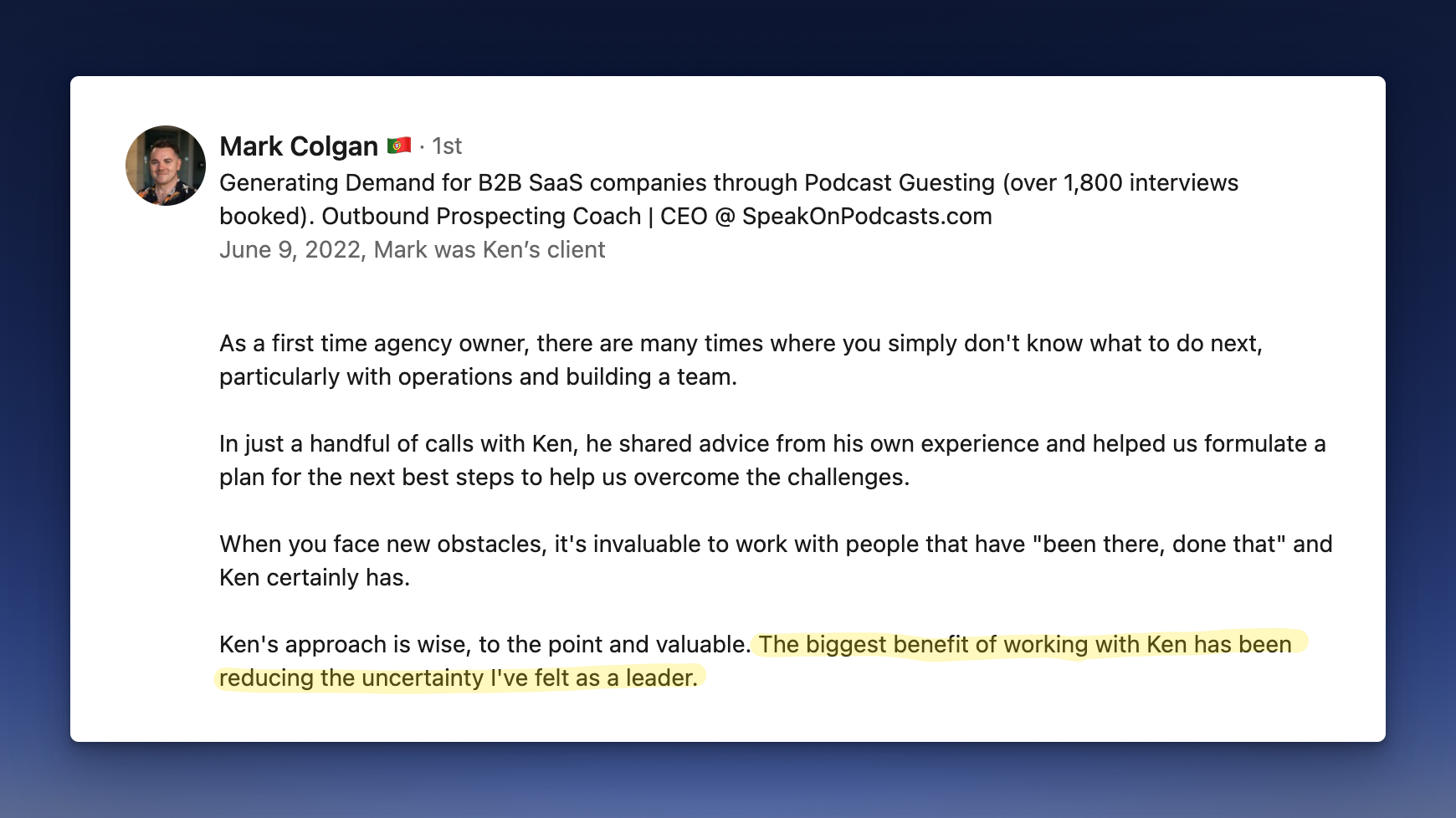 - I uncoached two B2B agency founders. The guidance I provided helped reset delivery leaders, so they no longer deal with client fires.